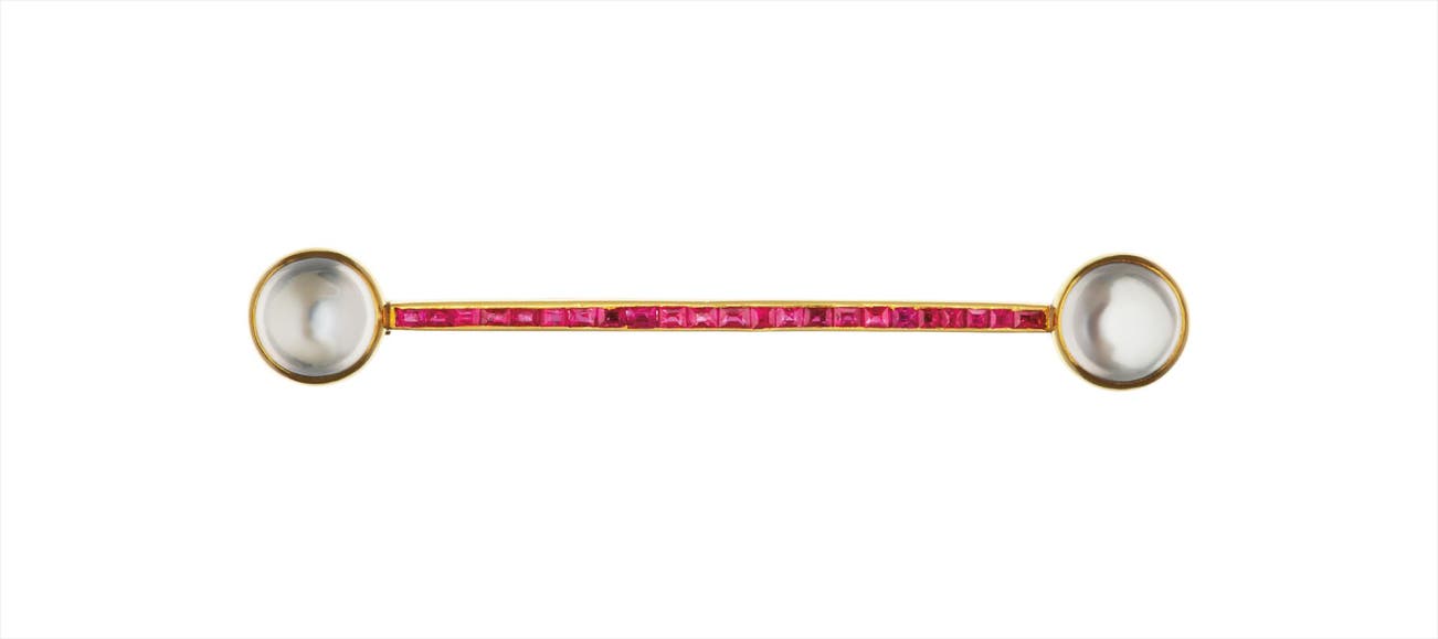 Designed as a bar pin set with a line of square-cut rubies, flanked by cabochon moonstones, mounted in 18K yellow gold, length 3 inches.