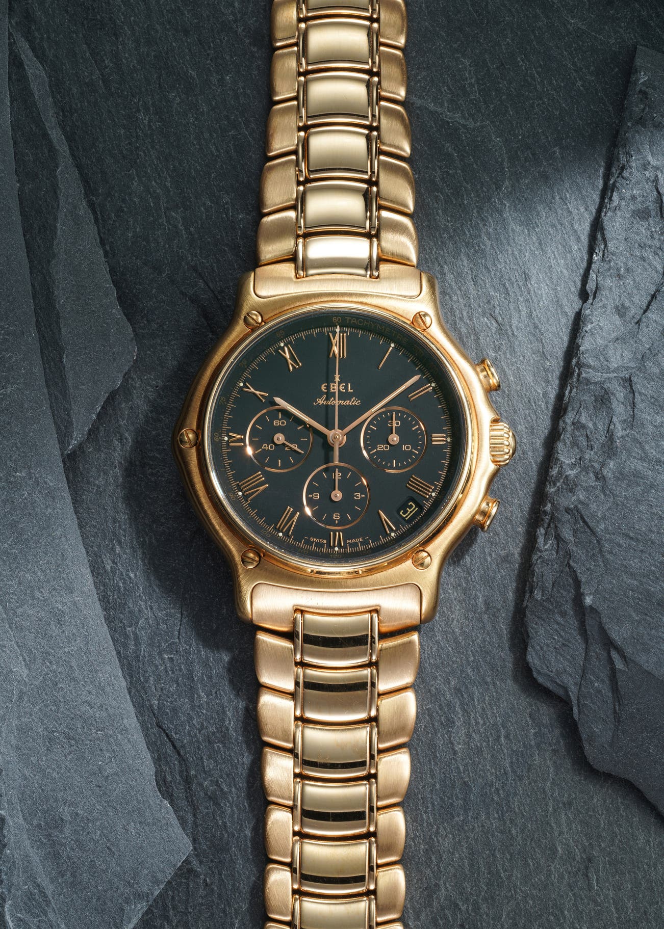 - One interesting variable when it comes to these chronographs is that Ebel seems to have created them in an almost endless series of dial configurations. The present watch features a black dial with applied gilt Roman numeral hour markers, complemented by the 18k pink gold case with a matching solid-gold link bracelet.