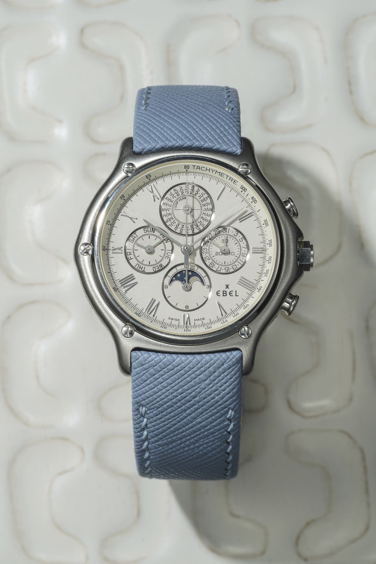 - Beyond its material rarity and complications, this watch delivers peak 1980s/1990s Ebel design: a complex case with five bezel screws, a hexagonal crown, mushroom pushers, an integrated strap system, and a tachymeter scale along the inner rehaut.