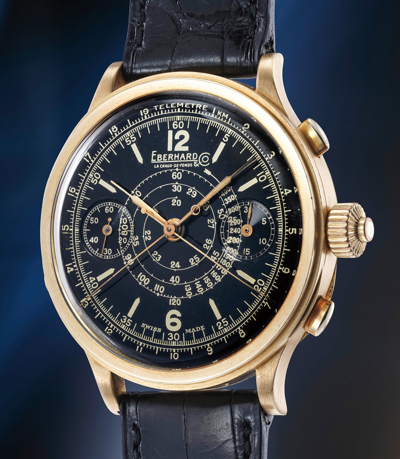 A highly attractive and rare yellow gold split-seconds chronograph wristwatch with stop function, snail-shaped tachometer scale and telemeter scale