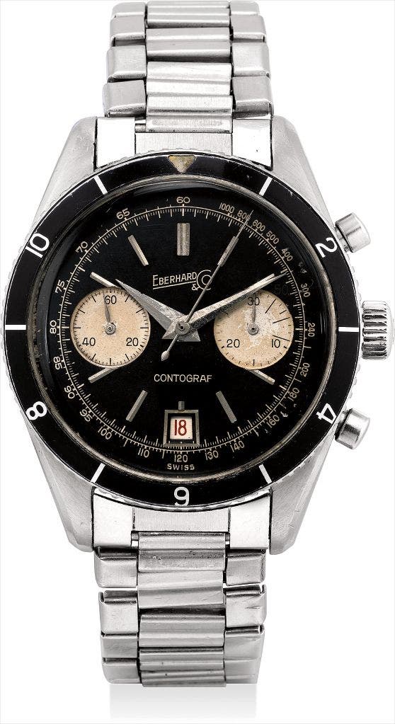 The present stainless steel chronograph measures 38.5 mm. in diameter and is fitted with a beautiful black lacquer dial. In addition, the present watch has been retained in very original and attractive overall condition.