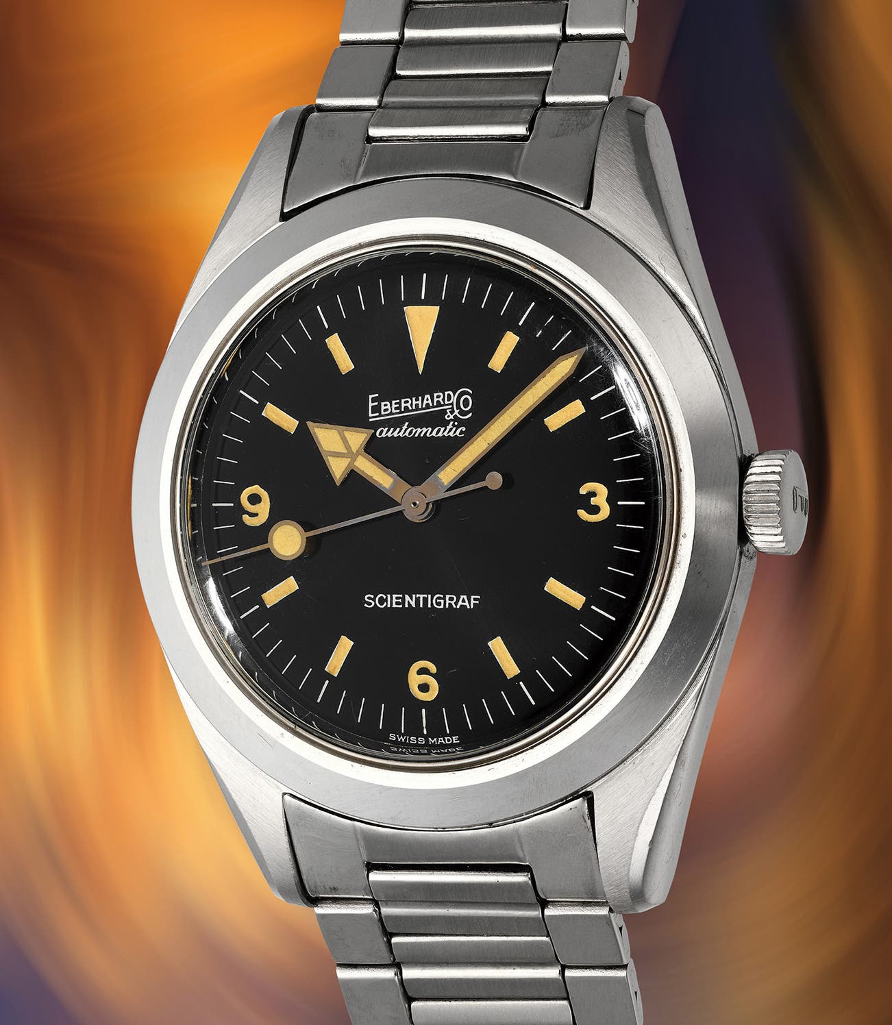 With an inner soft-iron movement cover, automatic caliber, and waterproof, screw-down caseback, the Scientigraf echoed the characteristics of its predecessors while incorporating the stylistic flair of Eberhard. The large, luminous arrow hour hand, lollipop seconds hand bold black dial with luminous 3-6-9 Explorer-style dial, and caseback engraving of an “E” shooting off forks of lightning set the Scientigraf.