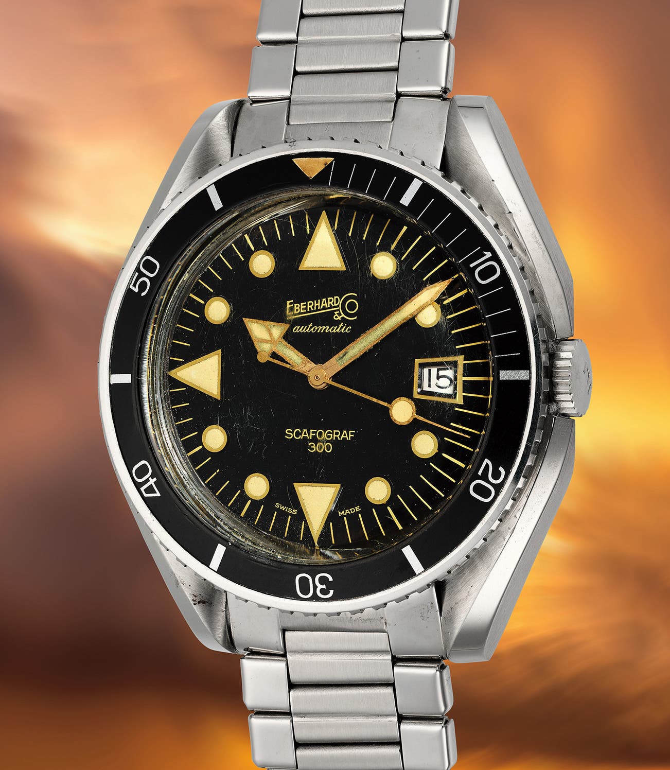 After the introduction of the Scafograf 100 in the late 1950s, Eberhard realized that to compete with the dive watches of Rolex, Omega, and Jaeger-LeCoultre, they had to incorporate a rotating bezel to use as a countdown timer for diving. The Scafograf 200 arrived shortly thereafter with an upsized 39mm case. Further developments were made in the Scafograf 300, most significantly a larger, 42mm case and an asymmetric date window.