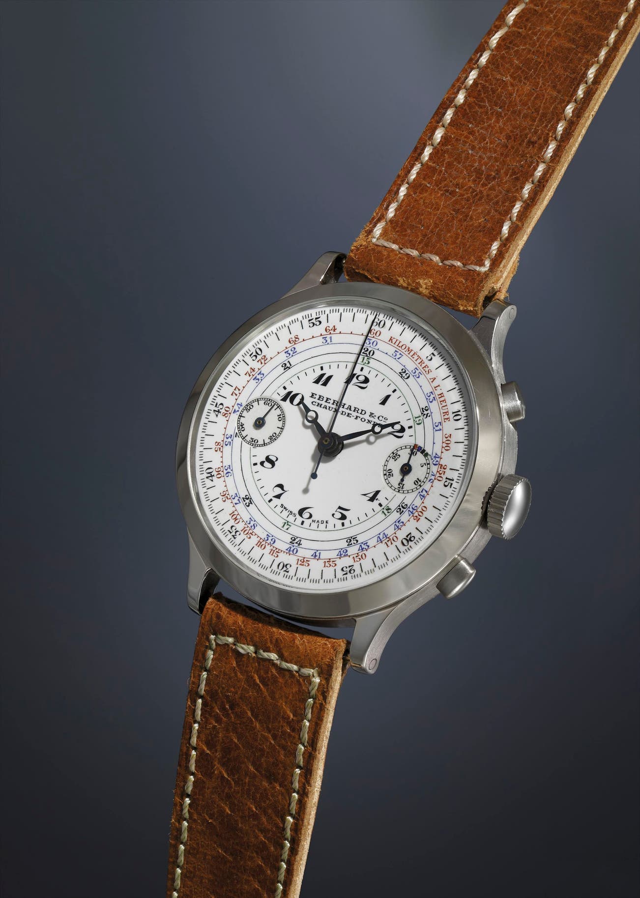 The present stainless steel chronograph measures a remarkable 40mm in diameter, and is fitted with a superb white enamel dial. The dial is complemented beautifully with a four-color tachometer scale and black Breguet numerals. The substantial case is fitted with olive pushers, fixed lugs and the Eberhard caliber 1600. The ‘292’ stamping found on the underside of the lug is correct as it matches the last four digits of the case number found on the inner case-back, reading 1’007’292.