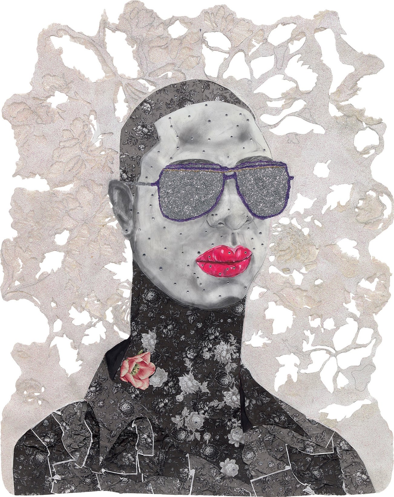 rhinestones, glitter, acrylic, graphite and appliqués on hand-cut paper