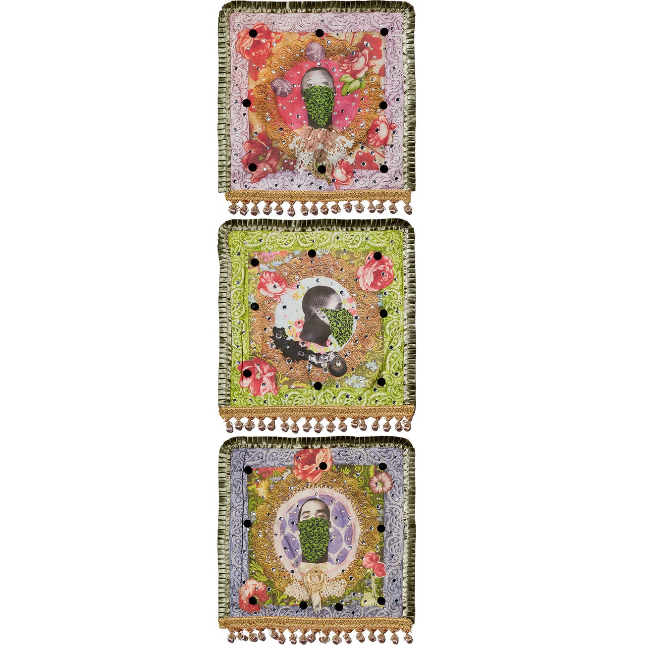 Three mixed media hand-embellished works, with digitally printed photographs, rhinestones, embroidery, fabric trimmings, and appliques, loose (as issued), all contained in the original cloth-covered portfolio.