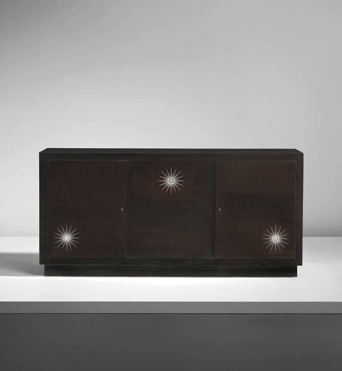 Photographs taken by Muthesius upon completion of the project show that the present lot was originally situated, along with another longer example, in the magnificent ground floor banquet hall. Imposing in its austerity, the room included an expansive dining table that stretched the length of the room and featured illuminated recesses for floral arrangements and tableware by Jean Puiforcat. The stained walnut veneers of both sideboards were inlaid with white metal marquetry in sun motifs, representing the Rajput ancestry that the Holkars of Indore claimed. The motif also appears within the monogram that Muthesius redesigned for Yeshwant Rao Holkar.