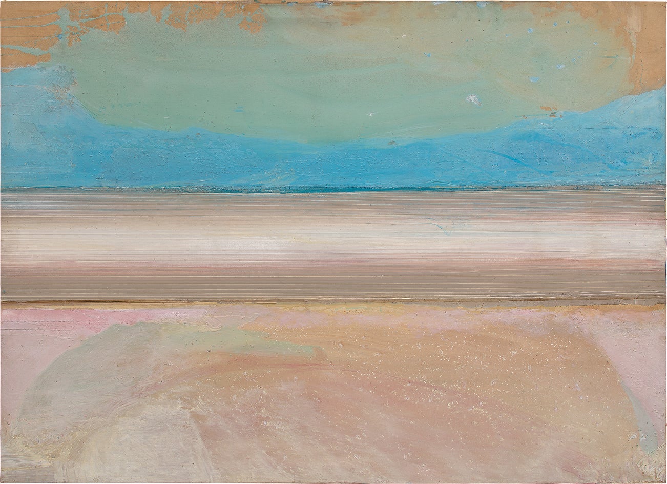Bisecting the canvas is one smooth brushstroke, broomstroke really, that radiates near-white light from the center and then shifts to warm pinks and sandy browns at its edges. Clark often experimented with white as a base for bright colors, creating a source of light within the paint. Here, we see that luminescence emanating from the horizon line before arching away in the warm blue-greens of the upper register and welcoming speckled pinks of the lower register. The incredible balance in the composition begs for the painting to be viewed first from the middle and then back and forth between the lower and upper regions. Clark’s use of the push broom meanwhile amplifies the importance of the color, revealing subtle but powerful differences in hue, saturation, and light in each region of the canvas. The sensitivity and understated power of this painting readily manifest the importance of his experience working from the context of a given location.