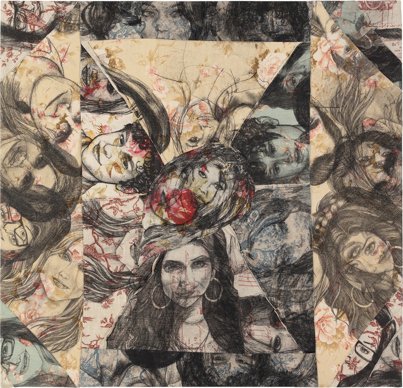screen print on stitched linen and cotton battings, stuffed with hair