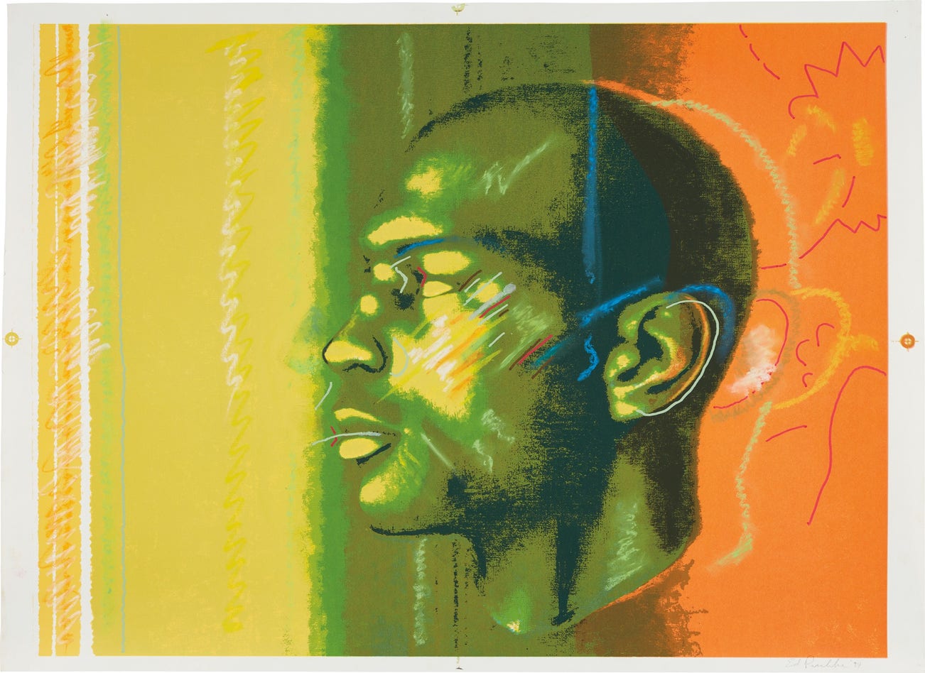 Unique screenprint with metallic ink and hand-coloring in pastel and enamel marker, on wove paper, with full margins.
