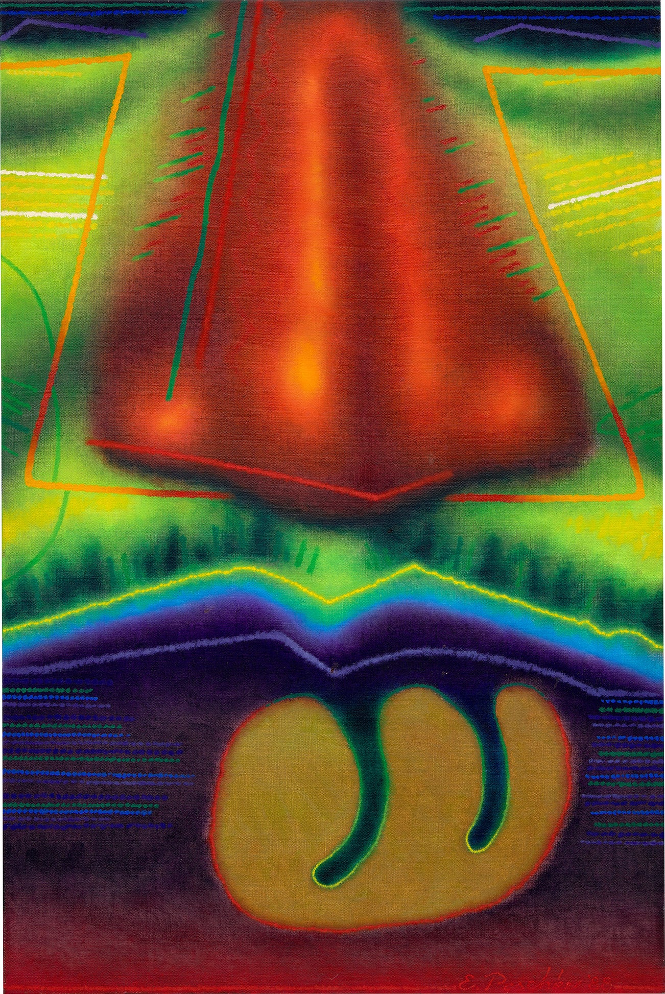 signed and dated “E. Paschke ‘88” lower right; signed, titled and dated ““DUMATTICA” ‘88 E. Paschke” on the overlap