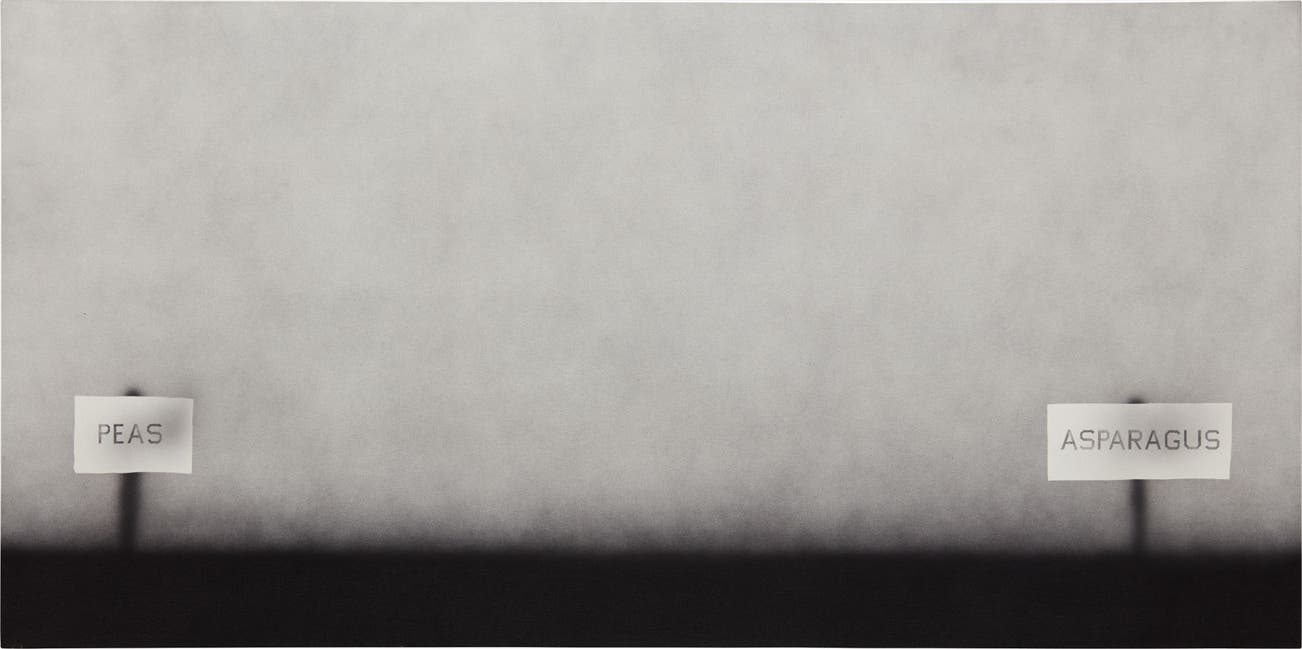 Of this simultaneous anonymity and familiarity, Ruscha explains, “a lot of my paintings are anonymous backdrops for the drama of words. In a way, they’re words in front of an old Paramount Studios mountain. You don’t have to have a mountain back there - you could have a landscape, a farm. I have a background, foreground. It’s so simple. And the backgrounds are of no particular character. They’re just meant to support the drama, like the Hollywood sign being held up by sticks” (Ed Ruscha quoted in R.D. Marshall, Ed Ruscha, London 2003, p. 239). This time, it is signs for peas and asparagus held up by sticks, dramatically rooted in a hazy and nameless black and white field. While there is no indication of exactly where this image comes from, in its nostalgic rendering, the painting feels undeniably familiar.