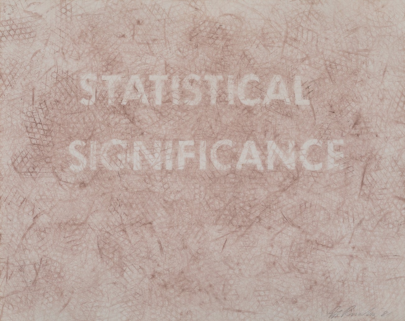 Whilst Ruscha’s techniques and materials vary across media, the medium of language has remained a continuous thread throughout his career. When interviewed in 1973, Ruscha stated ‘I love the language. Words have temperatures to me. When they reach a certain point and become hot words, then they appeal to me’ (Ed Ruscha, quoted in Howardena Pindell, ‘Words with Ruscha', in The Print Collector’s Newsletter, vol. 3, no. 6, January - February 1973, p. 126). Sliding across the boundaries of Conceptual and Pop Art, Ruscha’s words signify his interest in vernacular culture and his continuous observation of the cultural landscape. In this way, Ruscha becomes a recorder of society’s ‘signs’, just as his photographic works recorded the physical Californian landscape. Ed Ruscha’s most iconic works are those in which imagery and semantic coexist to brilliantly engage with and probe the interplay between image, symbol and text as creators of meaning. Throughout his career Ruscha has masterfully selected poignant words, titles and sayings from popular culture to create often witty and ironic compositions. In the present work, Ruscha has swapped literary and cultural references for scientific language. ‘Statistical significance’ - the probability that a relationship between two variables is caused by a significant factor rather than chance, perhaps makes a conscious reference to the physical process of rubbing chalk, seemingly so haphazard yet in fact highly considered.