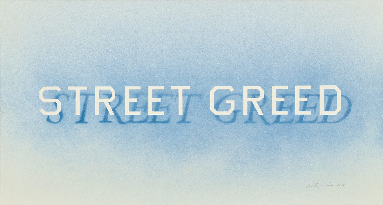 Expertly executed in the present work, Ruscha’s phrase ‘Street Greed’ casts a shadow against the ice-blue background gradient, conveying its tangible presence and three-dimensionality within the space of the artist’s microcosm. The finely faded surface which spans from the central text outwards evokes a similar surface lustre evident in the artist’s graphite or gunpowder works, the smooth and fine blend evocative of mass-produced advertising or the spray-painted metal chassis of the automobile industry. Encapsulating the artist’s biting wit and ability to synthesise a multitude of meanings in his sharp execution, the cadence of Ruscha’s phrase is evocative of the steps walked along the city streets, where both gluttony and human achievement are visible to see.