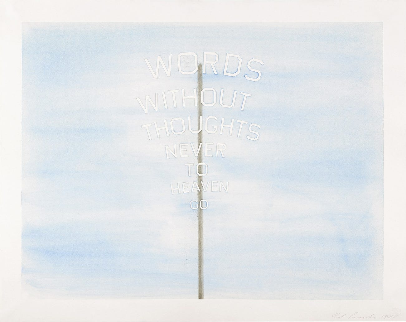 In the present work, the line “Words Without Thoughts Never To Heaven Go” floats atop a cloudy light-blue sky. The words, decreasing in size, are centrally stabilized by a vertical stick which holds them in place so they don’t float off with the clouds. The quote and heavenly scene touch upon Ruscha’s early upbringing as a Catholic. Shakespeare, too, is known to have referenced Catholicism. “Words Without Thoughts Never To Heaven Go” are muttered by Claudius while he is trying to pray, unaware that Hamlet has been watching him in order to kill him. Hamlet does not proceed, because according to Elizabethan belief, a person killed while praying and confessing sin "would directly to heaven go". As Ruscha explains, “In Act III, Scene III of William Shakespeare’s Hamlet, the King utters, 'Words without thoughts never to heaven go.’ This noble quotation is as timeless as it is poetic. It is a quotation that is profound and yet simple. For me, it burns with curiosity” (Ed Ruscha, A Proposal by Edward Ruscha for the Circular Ring and for the Lunettes of the New Miami – Dade Public Library, online).