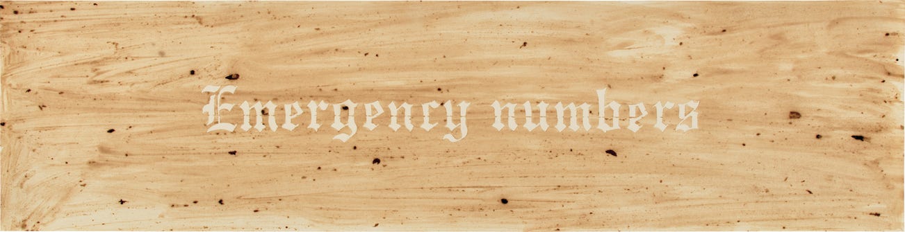 Emergency Numbers, 1973, is an exquisite example of Ed Ruscha’s unique artistic practice. The two words ‘Emergency Numbers’ are executed in gothic script and rendered in the negative space against a woody textured background. Ruscha’s choice of typeface and use of unconventional materials – cherry juice stained paper – intentionally possess no relevance to the meaning of the text. The present work exemplifies the artist’s experimentation with materials which typify the American experience such as blood, food, condiments and gunpowder, perhaps most famously in Stains, 1969 (Museum of Modern Art, New York), which comprises of 76 sheets of paper, each stained with a different substance such as Wine, Coffee and LA tap Water.