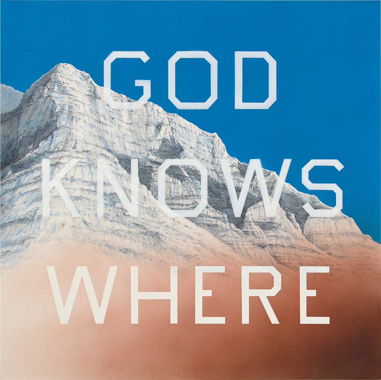 A majestic mountain top hails at the background of Ed Ruscha’s God Knows Where, 2014, while the painting’s three eponymous words, ‘God – Knows – Where’, occupy the foreground. Typical of Ruscha’s investigation of the symbiotic relationship between images and words, the present work is an exceptional example of his use of mountainous peaks as visual backdrops, referencing both the naturalistic theme of snow and the Hollywood appropriation of snowscapes, embodied most prominently by Paramount Pictures’ infamous logo. Silhouetted against a matte sky, the large mountain at the heart of the composition appears to be a cut-out, or a backdrop for a movie set. It flattens and muffles the adventurous potential of what lies beyond, accompanied only by the three words of an unknowable punchline. The text applied with a stencil in Ruscha’s emblematic font is, as the artist explains, ‘one of my own inventions, which I call “Boy Scout Utility Modern”. If the telephone company was having a picnic and asked one of their employees to design a poster, this font is what he’d come up with. There are no curves to the letters – they’re all straight lines – and I’ve been using it for years’ (Ed Ruscha, quoted in Kristine McKenna, ‘Ed Ruscha in Conversation with Kristine McKenna’, Ed Ruscha: Fifty Years of Painting, exh. cat., Hayward Gallery, London, 2009, p. 58).