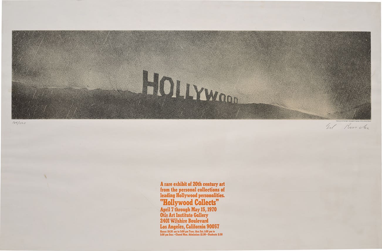 His most iconic works are at turns poetic and deadpan, epigrammatic text with nods to advertising copy, juxtaposed with imagery that is either cinematic and sublime or seemingly wry documentary. Whether the subject is his iconic Standard Gas Station or the Hollywood Sign, a parking lot or highway, his works are a distillation of American idealism, echoing the expansive Western landscape and optimism unique to postwar America.