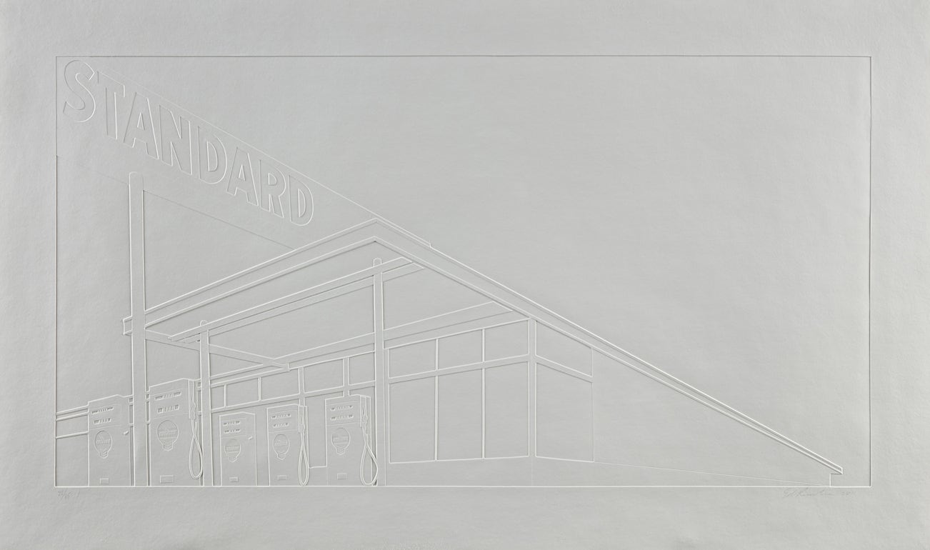 His most iconic works are at turns poetic and deadpan, epigrammatic text with nods to advertising copy, juxtaposed with imagery that is either cinematic and sublime or seemingly wry documentary. Whether the subject is his iconic Standard Gas Station or the Hollywood Sign, a parking lot or highway, his works are a distillation of American idealism, echoing the expansive Western landscape and optimism unique to postwar America.