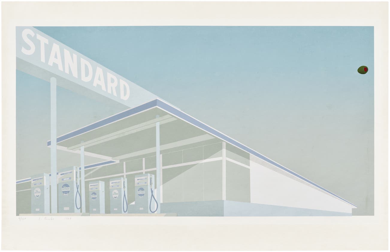 His most iconic works are at turns poetic and deadpan, epigrammatic text with nods to advertising copy, juxtaposed with imagery that is either cinematic and sublime or seemingly wry documentary. Whether the subject is his iconic Standard Gas Station or the Hollywood Sign, a parking lot or highway, his works are a distillation of American idealism, echoing the expansive Western landscape and optimism unique to postwar America.