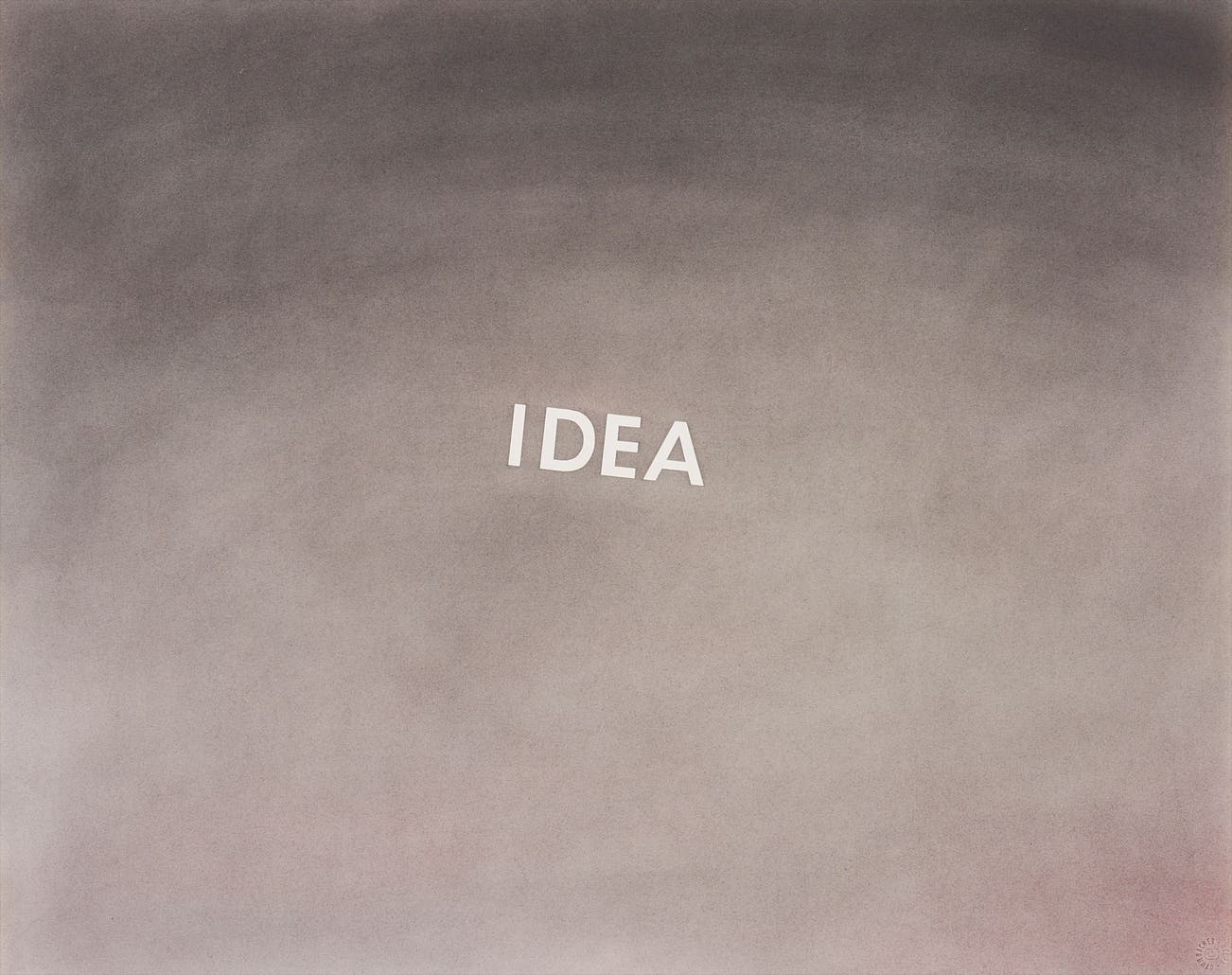 What the small-scale text of Idea, 1976 may lack in size, it makes up for in stern legibility and authority. The glowing white outlines of each letter radiates against the background grays. Every corner and curve of them shine brighter, deeper and heavier with every moment the viewer continues to stare. Like cars illuminating a highway billboard in the night, the viewer drives the solubility of this word, bringing both the word and its meaning to a very real and physical light, “I guess that’s what poets want to do: put ideas on stage. I settle for a single word.” (Ed Ruscha in R. Cooke, “Ed Ruscha: There’s room for saying things in bright shiny colours,” The Observer, September 11, 2010)