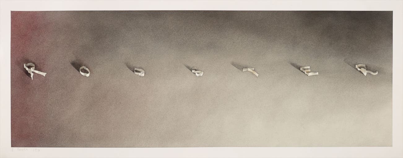 The present lot, Rooster, 1970, executed in crimson powdered pastel and gunpowder on paper, captures Ed Ruscha’s iconic and unrivaled handling of text and landscape; here ribbon-like letters swirl upon a smoky backdrop of charcoal grays and burgundy reds. Reading from left to the right the “R” rests upon a deep cardinal red border, a foreboding start to the narrative. As the word is spelled out, the red dissipates into a light grey; it travels horizontally across the composition to the paper’s far right edge, reminiscent of the early gelatin silver photographic prints which form the foundation of Ruscha’s oeuvre. Finely executed, work emphasizes the warm tone that Ruscha admired and embraced in his materials. The present lot is a pillowy trompe l’oeil that captures Ruscha’s subtle genius in both its composition and technique. Seamlessly blending text with visual illusion, it is a masterful example of the artist’s multifarious works on paper.Ruscha draws his artistic technique from the slick, flattened backdrops of Hollywood set design and the graphics of rolling movie credits. The viewer senses that the ribbon-like, silvery white letters may at any moment disappear from the screen as they stroll across the page. But each letter casts delicate and differentiated shadows onto the amorphous background of the sheet. There are also “high art” allusions at play here. The smoky gradations of light and shade that merge the planes of the composition could be found in the canonical works of Old Masters. The traditional power of these techniques comes into conjunction with the visual transience of mass media. As the artist explained in reference to these impermanent words and phrases, “When I see a word or phrase, or hear one (on the radio or in the street), I have to capture it immediately. Otherwise it will slip away from me, disappear.” (Ed Ruscha in Margit Rowell’s Cotton Puffs, Q-Tips©, Smoke and Mirrors: The Drawings of Ed Ruscha, New York, The Whitney Museum of American Art, 2004, p. 15)
