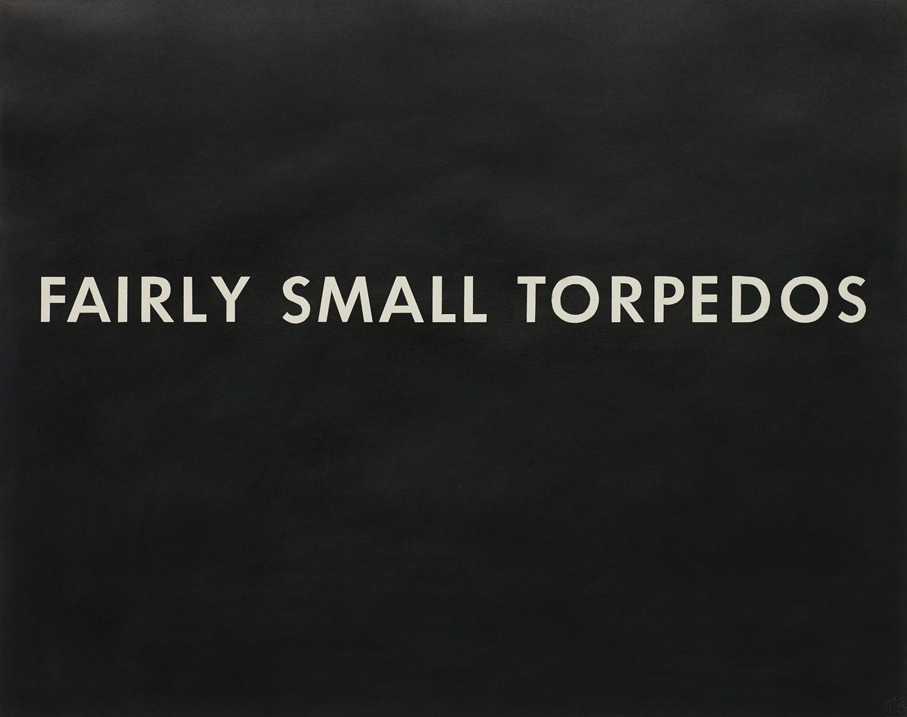 In a contemporary context, Ruscha’s words even have much in common with the randomised phrase generation of CAPTCHAs, which require a user to type out a combination of words to prove that they are human – perhaps the ultimate in the semiotics of postmodernity. His words may emerge as objects but don’t necessarily remain so; instead they have the potential to be re-imagined as overhead conversation, snippets of verse, or a half-glimpsed headline. Ruscha pulls absurdity from the flux of mass media into a coherent statement of his penetrating gaze. In Fairly Small Torpedoes, he creates an artwork as conceptually wise as it is graphically striking.