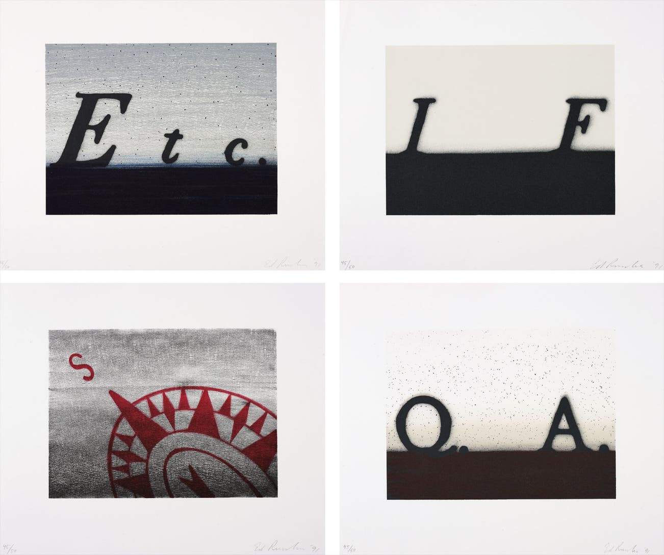 His most iconic works are at turns poetic and deadpan, epigrammatic text with nods to advertising copy, juxtaposed with imagery that is either cinematic and sublime or seemingly wry documentary. Whether the subject is his iconic Standard Gas Station or the Hollywood Sign, a parking lot or highway, his works are a distillation of American idealism, echoing the expansive Western landscape and optimism unique to postwar America.