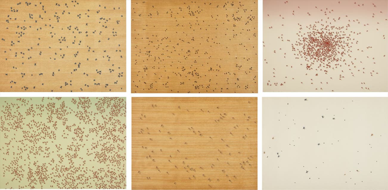 Including: Flies; Black Ants; Swarm of Red Ants; Red Ants; Cockroaches and Pearl Dust CombinationThe soil for the cover of the portfolio was gathered from the playground at Hawthorne Elementary School, which Ruscha attended, in Oklahoma City.