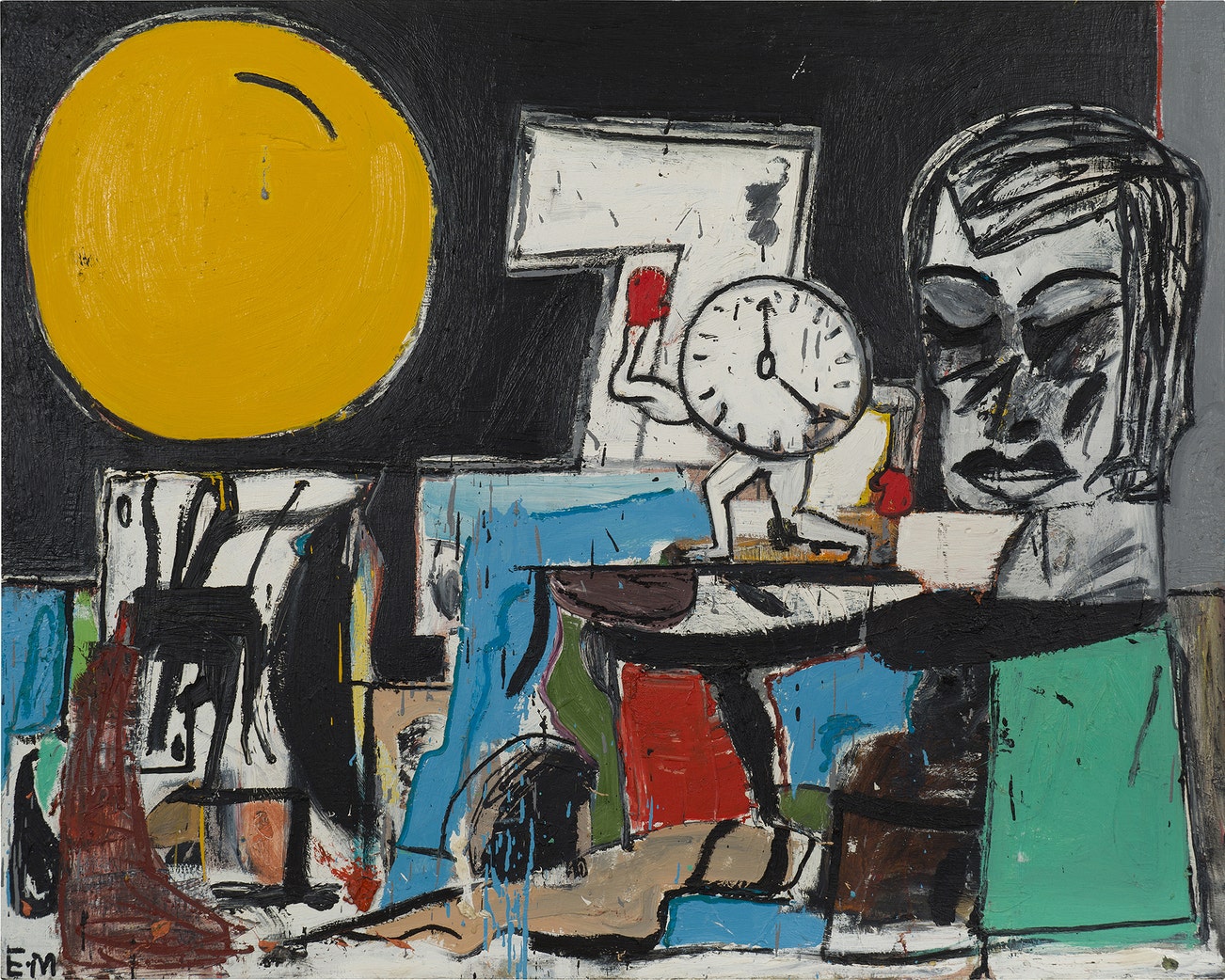 signed with the artist's initials 'E.M' lower left; signed and dated 'E. MARTINEZ 11' on the reverse; signed with the artist's initials 'EM' on the stretcher