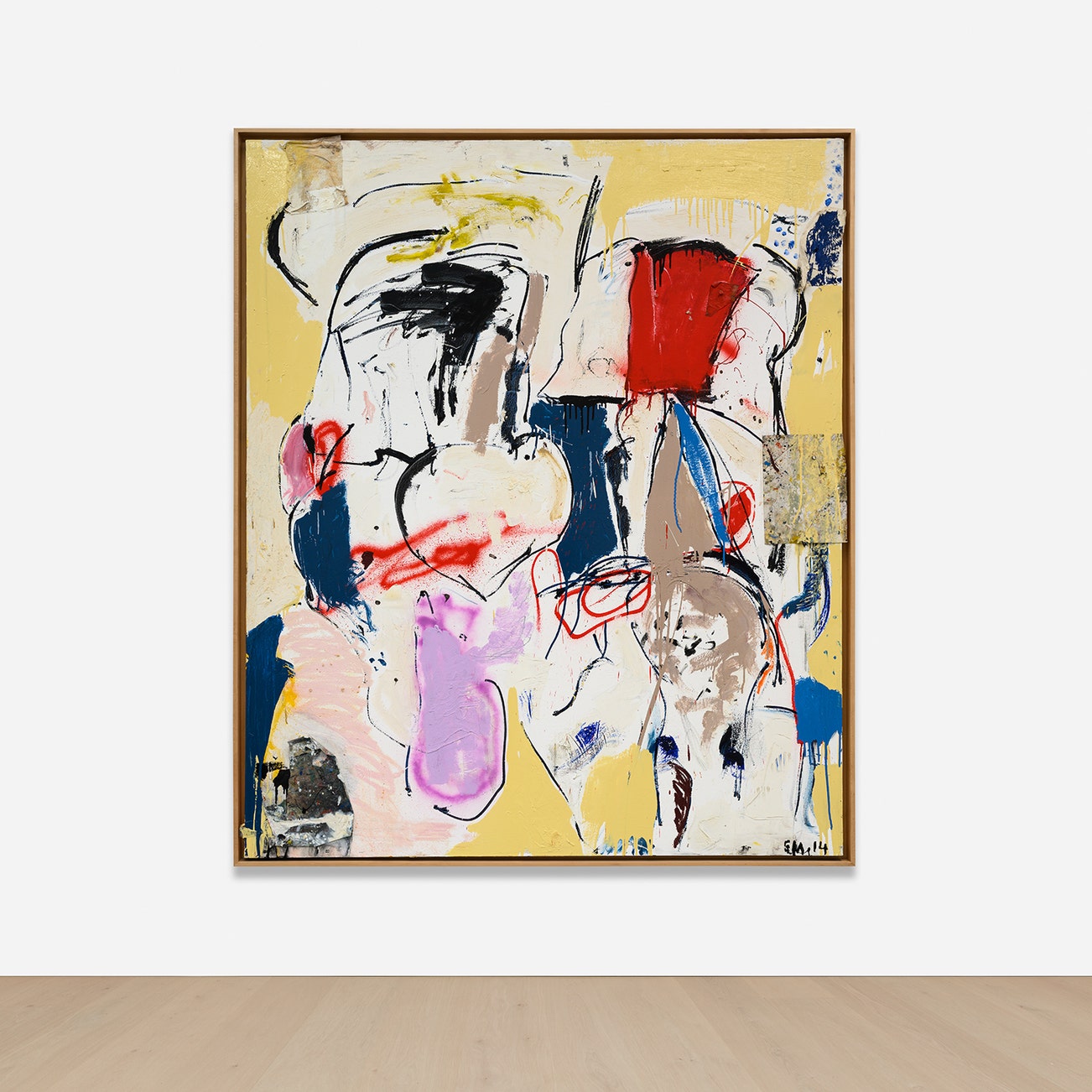 spray paint, oil, enamel, collaged computer paper, baby wipes, thumbtack and paper on canvas