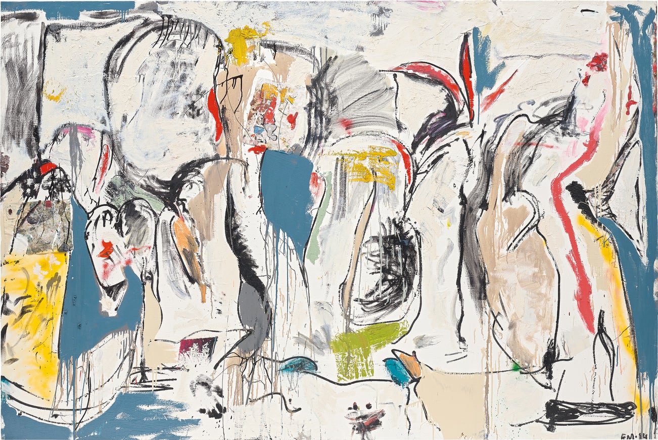Yet despite demonstrating masterful balance, the animation within Neanderthal Jeans stems from an impetuous gesture that knows no academic constraints. ‘It’s completely instinctual’, the artist has admitted. ‘I don’t know color theory, and I’m not concerned if I’m doing it right or if I’m doing it wrong. It’s just the way I do it’ (Eddie Martinez, quoted in Ted Loos, ‘Eddie Martinez’s Triumphant Abstractions Land at the Bronx Museum of the Arts’, Cultured Magazine, November 2018, online). It thus appears that, in the hour of painting, Martinez channels an awareness of space and colour that allows him to experience the composition in real time, birthing it in a spontaneous, natural jest. Combining all of Martinez’s most celebrated painterly qualities, Neanderthal Jeans successfully conveys the visual universe that has cemented his oeuvre as one of the foremost of his time.