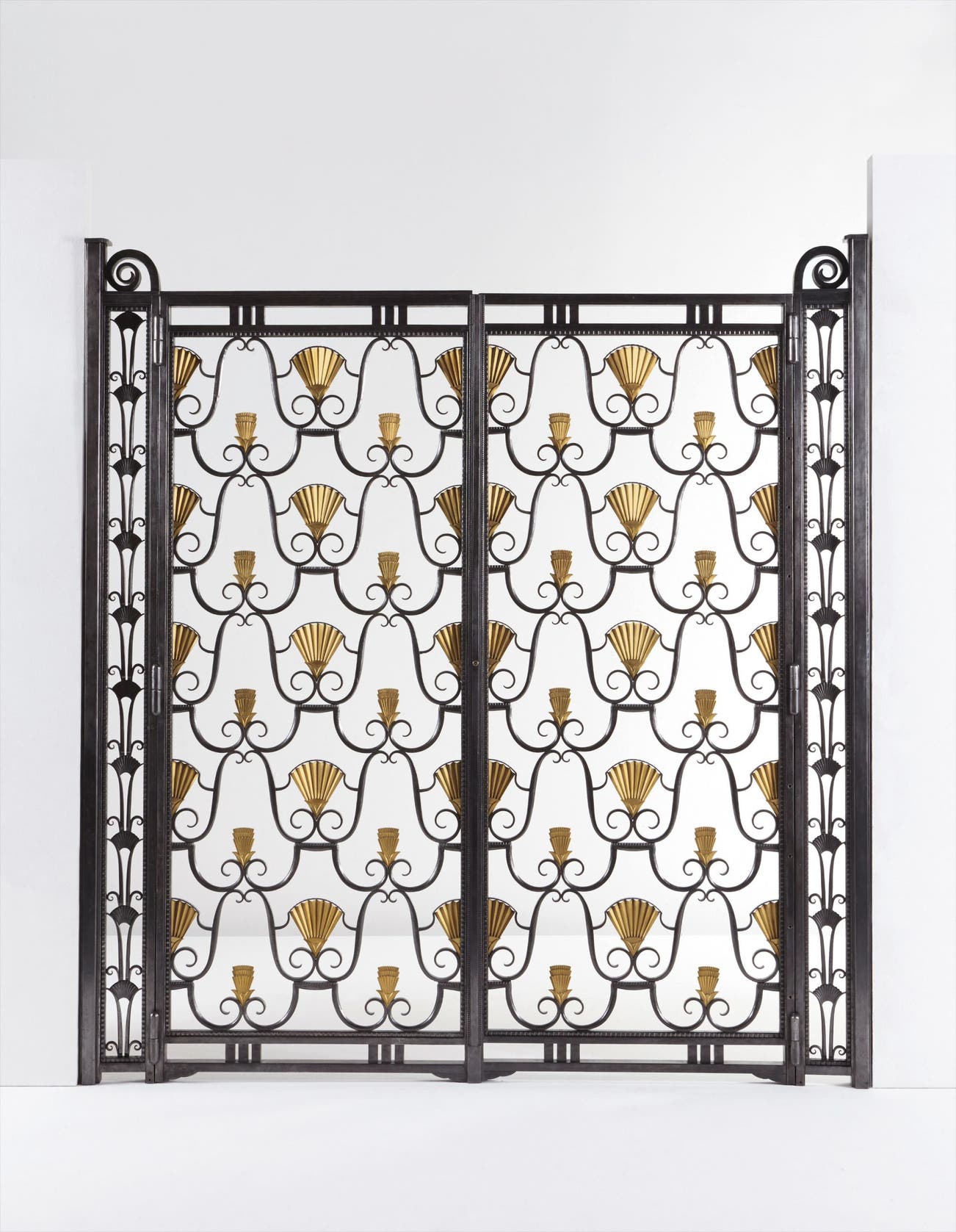 The iron doors offered here have a joyful, sprightly appearance. The design is formed by a half-drop repeat of large and small pleated Egyptian fans enclosed within curved iron bars that end in C-scrolls. These pleated fans mimic lotus flowers, whose alternating sizes give the design a playful aspect. This technique of playing with two sizes of the same motif creates a syncopation that is visually upbeat and pleasing.