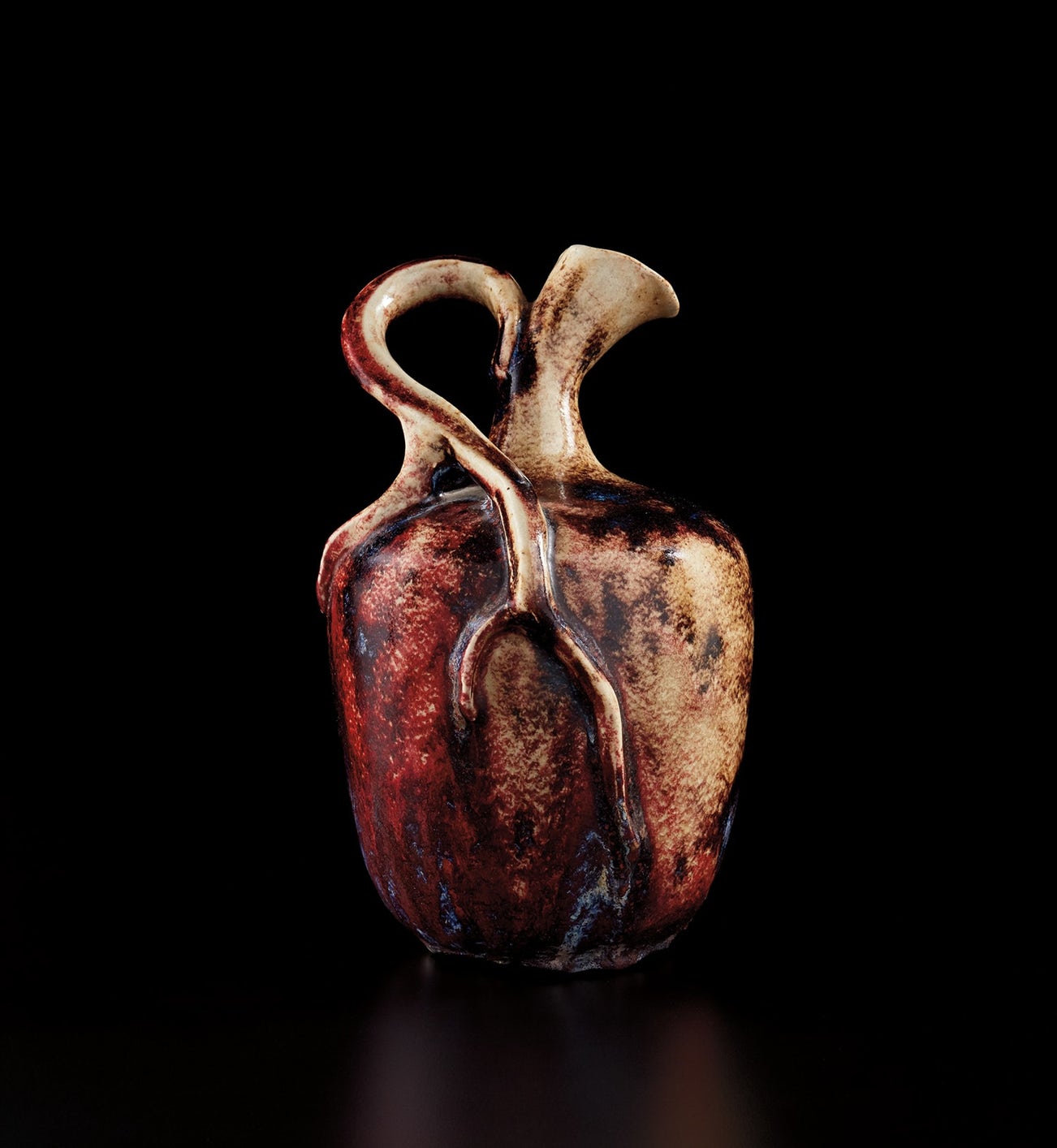 Stoneware, flowing layered red and green glazes.