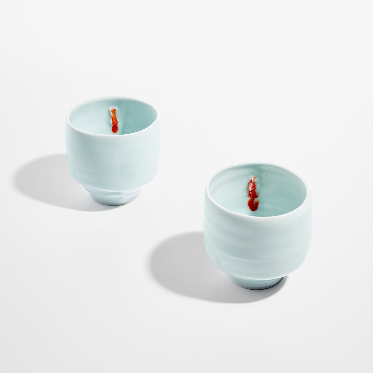 Porcelain, celadon glaze, red glazes over impressed designs in the interior.