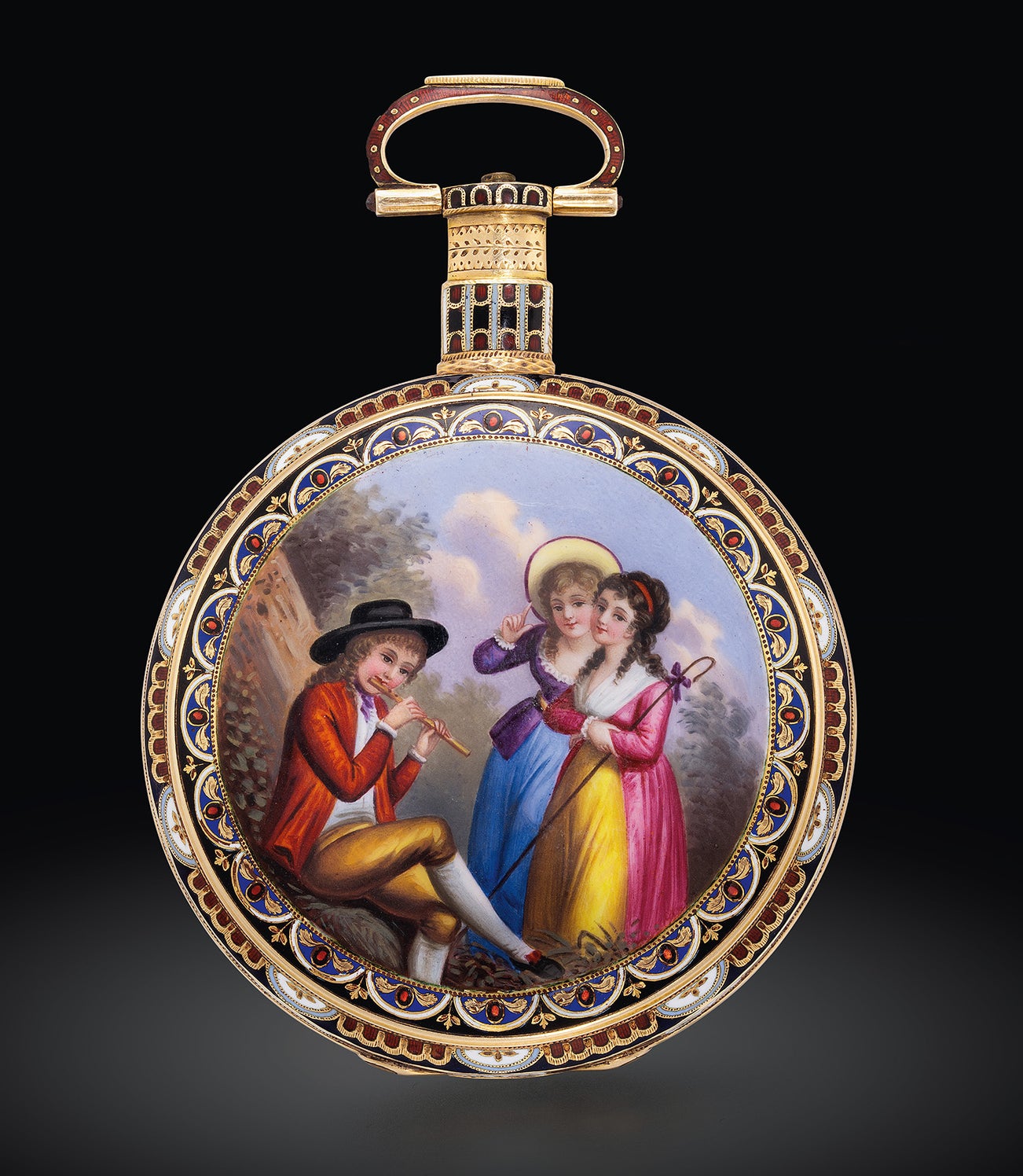 In these “Chinese” market pocket watches by Juvet, romanticized country scenes were a popular decorative motif for the enamel panels. These bucolic depictions were inspired by artists such as William Hamilton (1751-1801). His series "Morning", "Noon", "Evening" and "Night" may have influenced the composition of the enamel panels on the present watch, which features a young shepherd playing the flute for two maidens in the countryside. Only a handful of examples by Juvet are known to feature this same pastoral scene.
