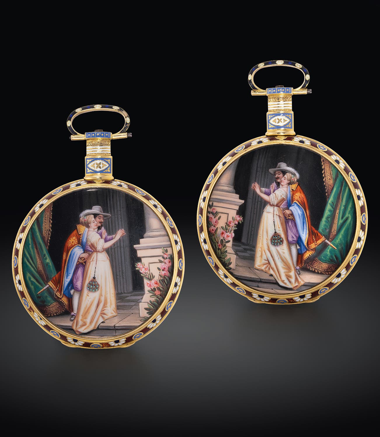 Each pocket watch proudly displays Juvet's signature ornate enamel work on the caseback, a meticulous process that involves applying vibrant enamel over delicately engraved images. The scenes depict a couple in love—a dashing Musketeer and a lady with a peacock fan—capturing the essence of courtship in rich, enduring colors that have stood the test of time.