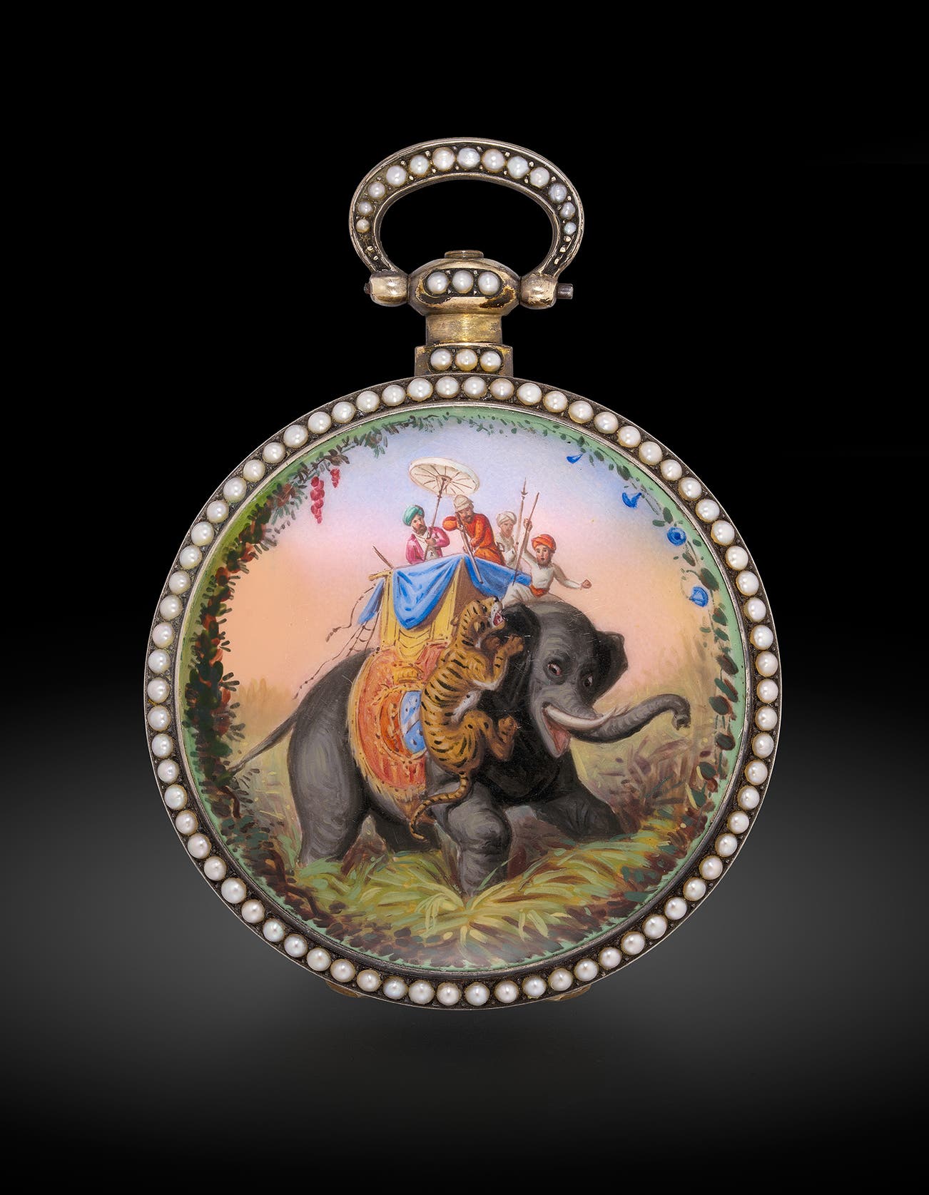This magnificent Empire‑style pearl‑set pocket watch, likely attributed to Pierre‑Amédée Champod, captures a dramatic hunting scene: Indian hunters confronting a tiger from the back of an elephant. Executed in vivid polychrome enamel, the scene exemplifies the fascination of Qing dynasty elites for depictions of exotic animals and distant lands. Measuring 57 mm and numbered 293, the present piece is dated to the 1830s and preserved in remarkable condition.