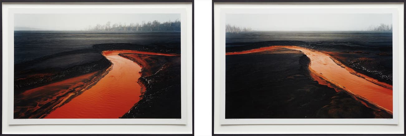 The artists whose works were included in that show, from Robert Adams to Henry Wessel and Lewis Baltz, all raised awareness of human’s industrial fingerprints on their environment, from skid marks on the road to broken trees on the side of a highway and crumbling cliffs abutting growing suburbs. Similarly, Burtynsky’s Nickel Tailings, draw attention to the consequences of mining. The deep orange and red colors flowing downstream are the direct result of separating nickel from ore, which causes the residual iron—or tailings—to oxidize. Burtynsky has stated that “these images are meant as metaphors to the dilemma of our modern existence; they search for dialogue between attraction and repulsion, seduction and fear.”