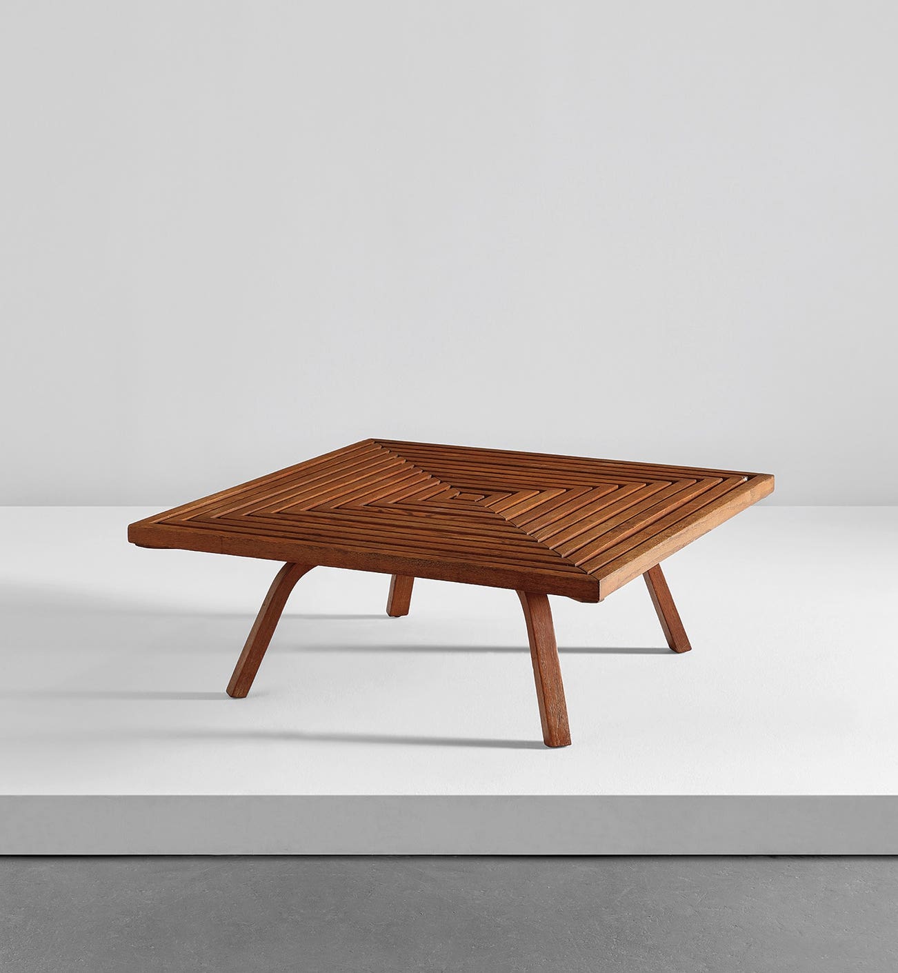 The present table is a rare example from the Fulbright Industries furniture line designed by Edward Durell Stone, produced between 1950 and 1952. The formal qualities of Stone’s architecture – consecutive lines, a motif based on a square divided into quadrants – are evident in the structure and pattern of the tabletop. The bentwood base echoes the porticos that lined the lower portion of many of his iconic building facades.