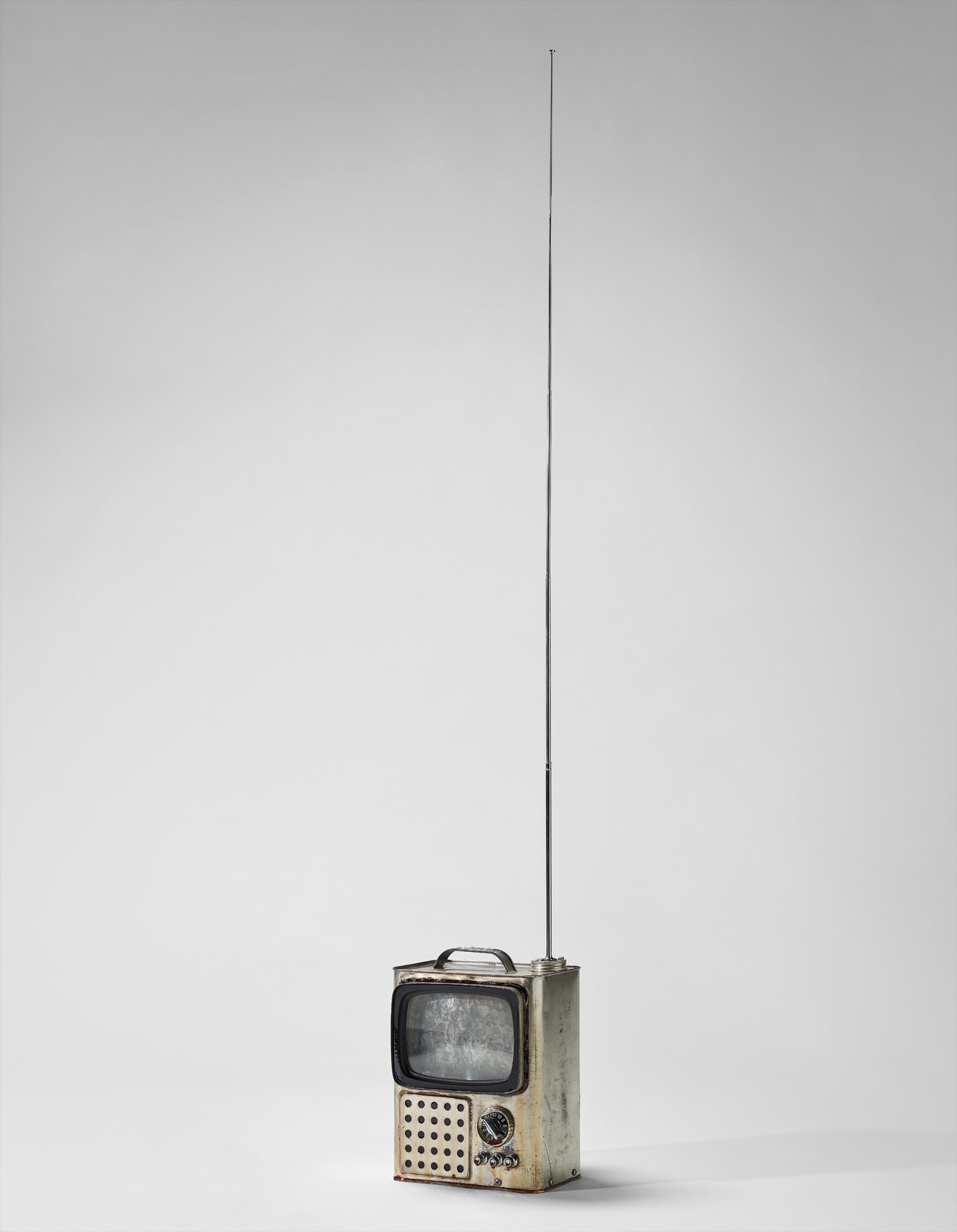 Multiple comprising metal tin can with a Fresnel lens system, soldered fixings, antennae, and hand-applied epoxy resin.