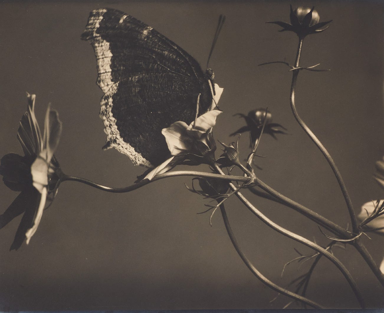 Steichen’s deftly composed study of a Mourning Cloak butterfly perched amidst the blossoms of the Cosmos plant was almost certainly made at the time the photographer executed his more ominous Diagram of Doom series, in which the same type of butterfly is surrounded by looming shadows. Steichen was an avid and expert gardener and would have been familiar with the Mourning Cloak, a widely distributed butterfly in North America. This photograph comes originally from the collection of Helga Sandburg, the daughter of poet and Steichen biographer Carl Sandburg. Carl Sandburg married Steichen’s sister, Lillian, in 1908, and Helga was the youngest of their three daughters.