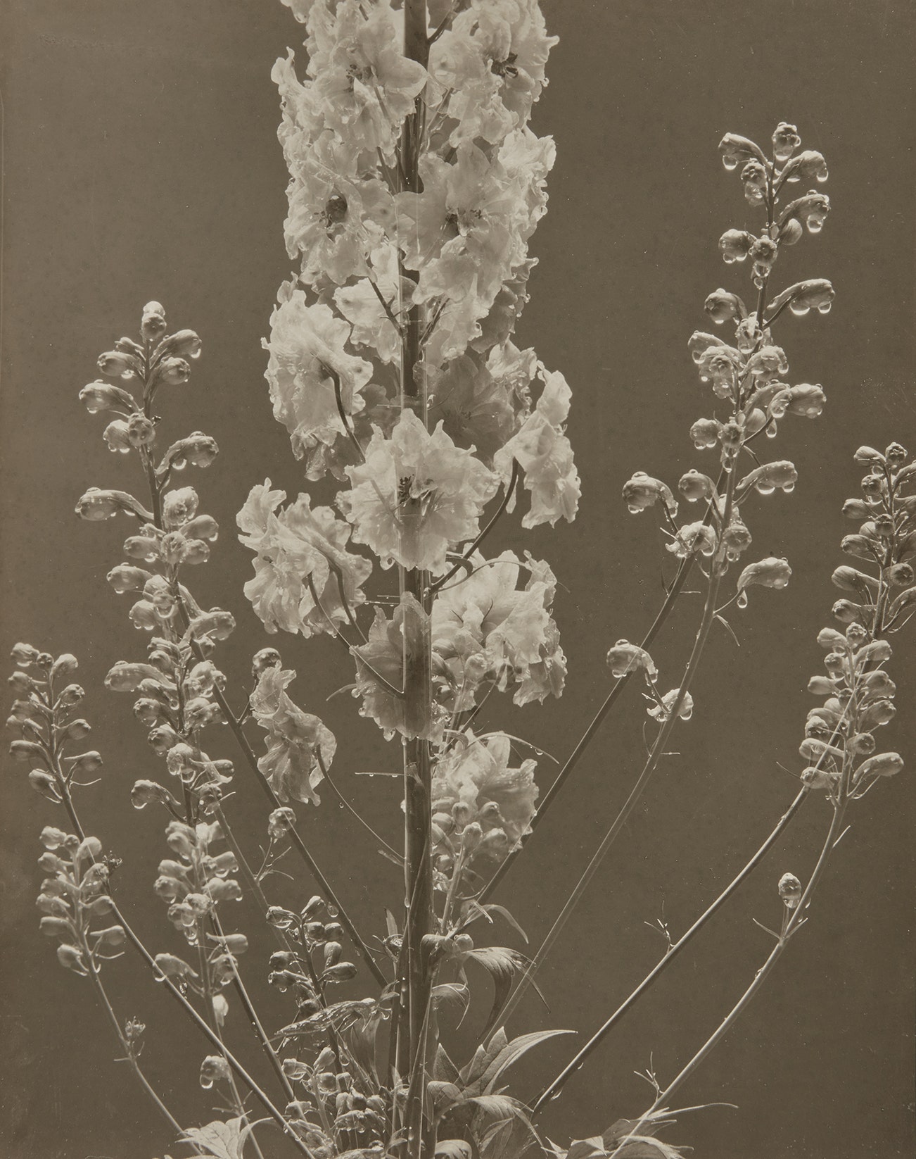Annotated 'pale blue spirals of delphinium early in the morning with dew on' by Carl Sandburg in pencil on the verso.