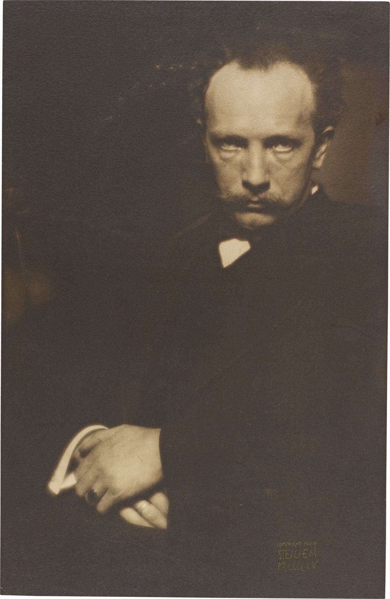 Steichen had photographed many great artists and literary figures and was extremely proud of these portraits. Artists were often photographed in the company of their creations or surrounded by clues to their talent. The portrait of Strauss is somewhat unusual as this is not how Steichen chooses to arrange him; in the variant of the image shown in this lot, Strauss is seen getting up from his chair with flowers directly in the foreground receiving equal billing to the sitter perhaps as a symbol of his reputation for being a romantic. However, Strauss in the current portrait looms from the darkness with strong high-lights around his head and eyes making him look directly in to our souls with an unnerving intensity. He seems unapproachable, unavailable, god-like and enigmatic all at once. There is an uncanny feeling that Steichen has managed to somehow represent the sensation that lurks at the very bottom of Strauss’s complex music. Steichen undergoes a complete giving over of his own self in order to fall in to the creation of the ultimate essence of another. The puzzle of Steichen’s process; full of technical enigma, free of the confines of conventional printing and a velvety dream brought to life is here entwined with a subject infused with raw emotion creating a profoundly moving experience, so much so, that the flesh of Strauss becomes a warm body that we begin to know.