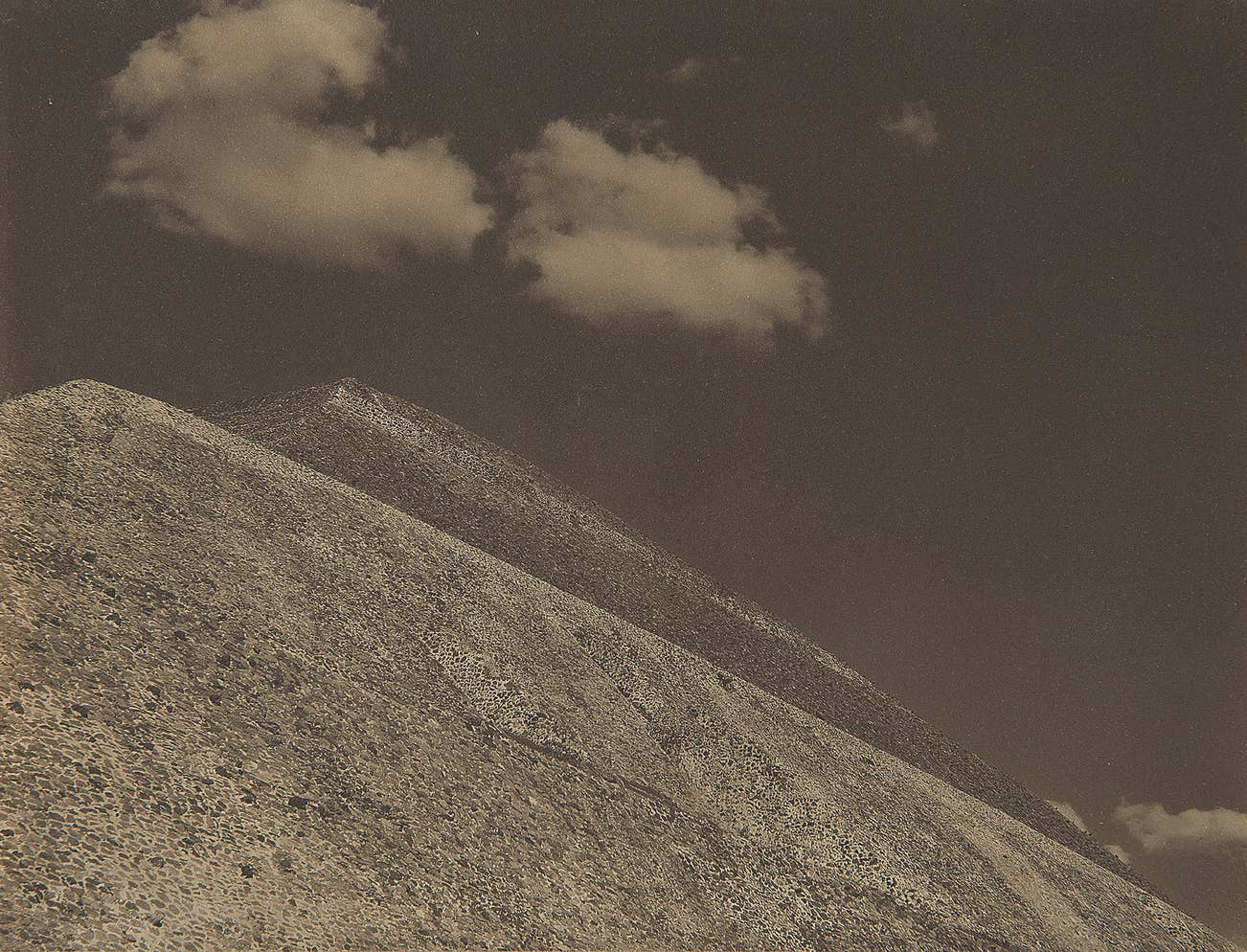 Edward Weston made an excursion to the Pre‐Columbian archaeological site at Teotihuacán in November of 1923, accompanied by a small group of artists and friends and ‘three cameras, good food, and plenty of wine’ (Daybooks, Mexico, p. 33). The massive Pyramid of the Sun, the center of the ancient city of Teotihuacán, was then, as now, one of the most significant surviving monuments of Mesoamerica, and Weston photographed it from two different vantage points. The view most frequently reproduced is the Pyramid from a distance (Conger 108); far scarcer is the present view, which, in Weston’s treatment, transcends the documentary to achieve a more profound of visual experience.