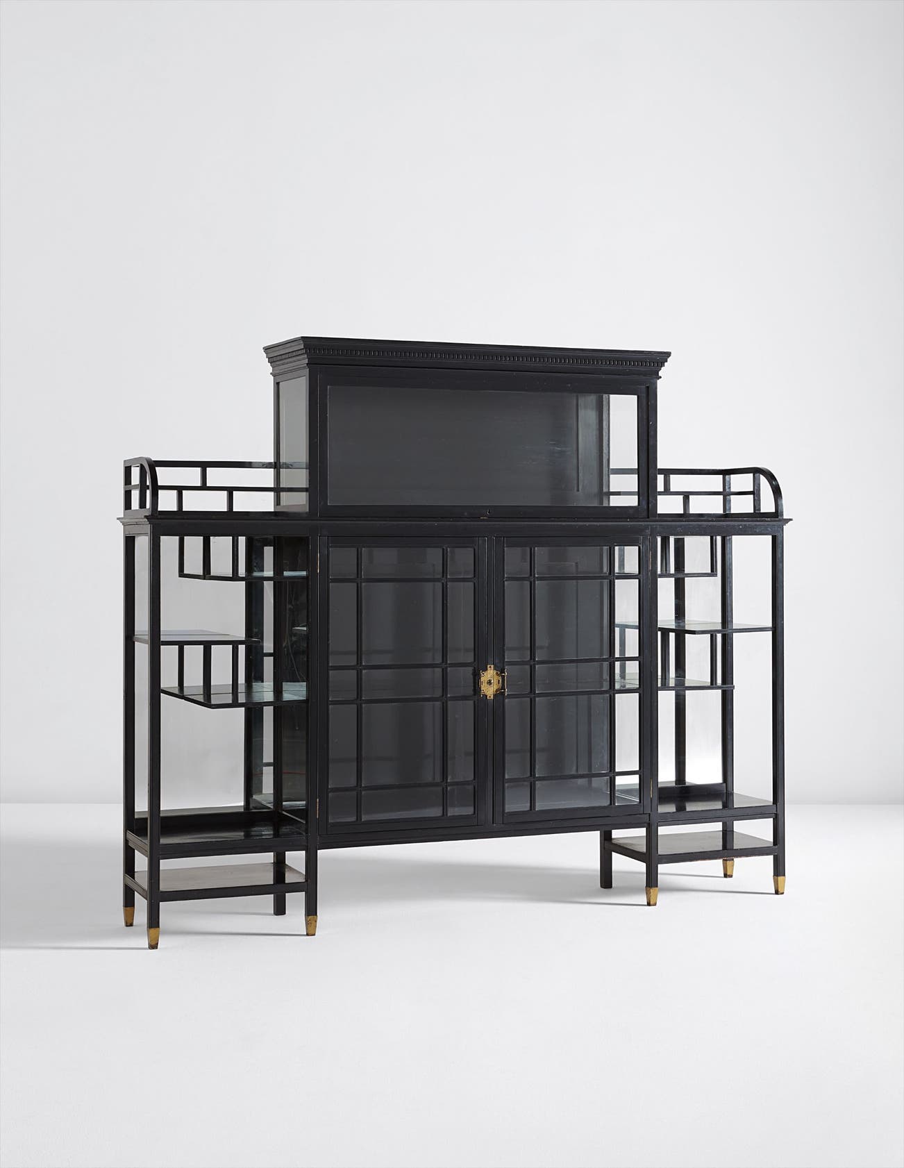 The present lot is an example of a type of cabinet used in the late nineteenth century for the display of various objects, often the Japanese (and Japanese-inspired) porcelain that was especially popular in the 1870s. Godwin’s interest in the arts of Japan is expressed in the watercolor illustrated below, which includes a trellis pattern in the background that is echoed in the rail decoration of the present design.