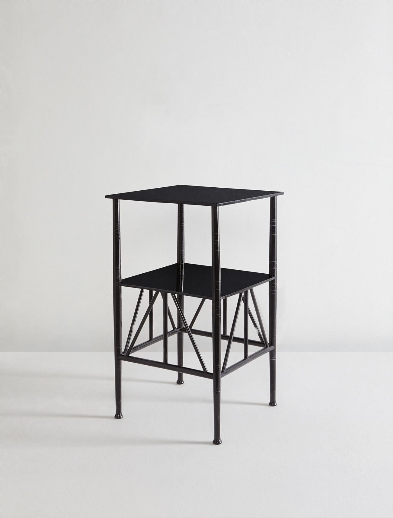 A leader in the aesthetic movement in England, Godwin drew on influences from India, the Middle East, China and Japan. Godwin’s furniture is characterized by an amalgamation of styles and reflects his varied antiquarian interests from eighteenth-century Jacobean and early English furniture to restrained Japanese forms. The present coffee table was inspired by depictions of Egyptian furniture that Godwin sketched at the British Museum, as evidenced by the angled stretchers that support the lower square shelf. In a typical pairing of Eastern and Near-Eastern influences, an ebonized finish mimics that of traditional Japanese furniture, and reflects the Aesthetic movement’s preference for a visible wood grain.