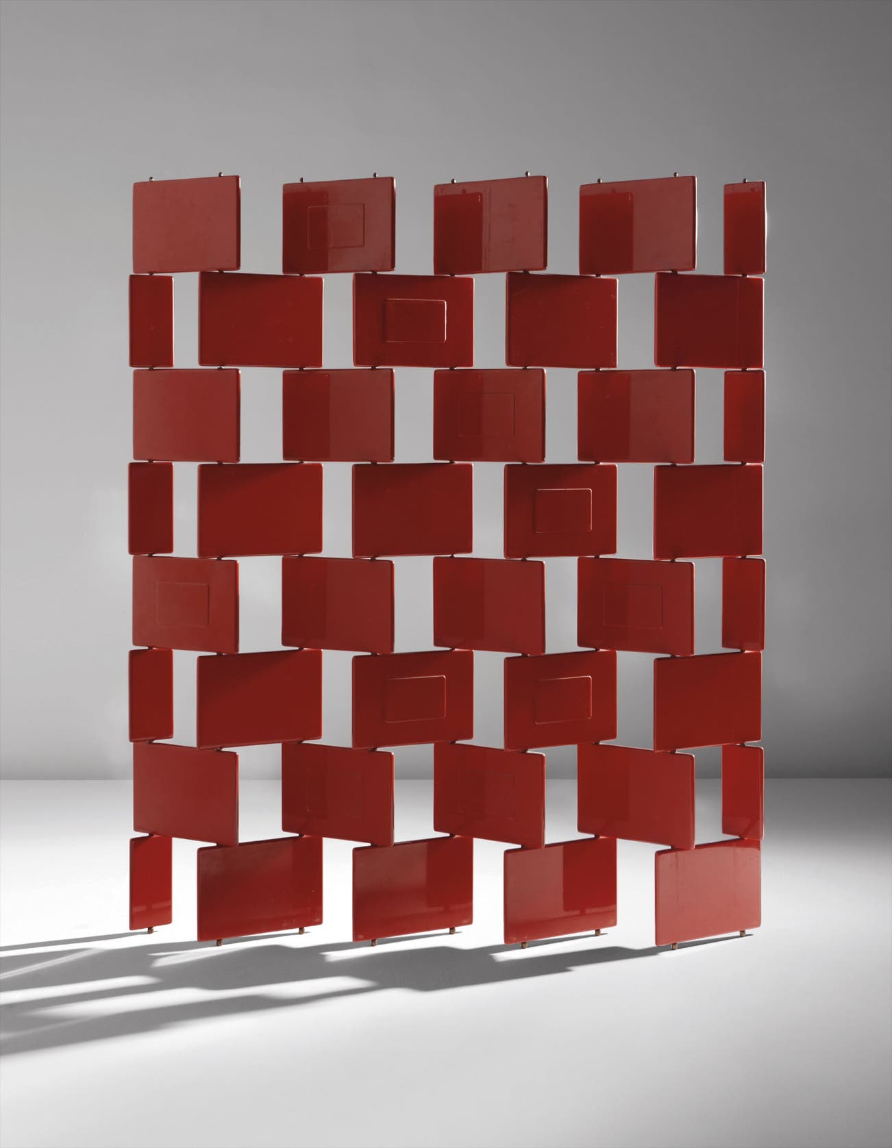 In an undated letter to her niece Prunella Clough, Gray claimed to have produced only ten “Brick” screens, as noted by Dr. Jennifer Goff, Curator of the Eileen Gray collection at the National Museum of Ireland (Eileen Gray, Her Work and Her World, 2015, p. 441). This small group comprised an early black painted example, another pale wood example, and two white painted examples, after which she produced her various lacquered “Brick” screens, the majority of them black. This red screen (illustrated p. 445) dates to Gray’s final burst of creativity in the early 1970s.