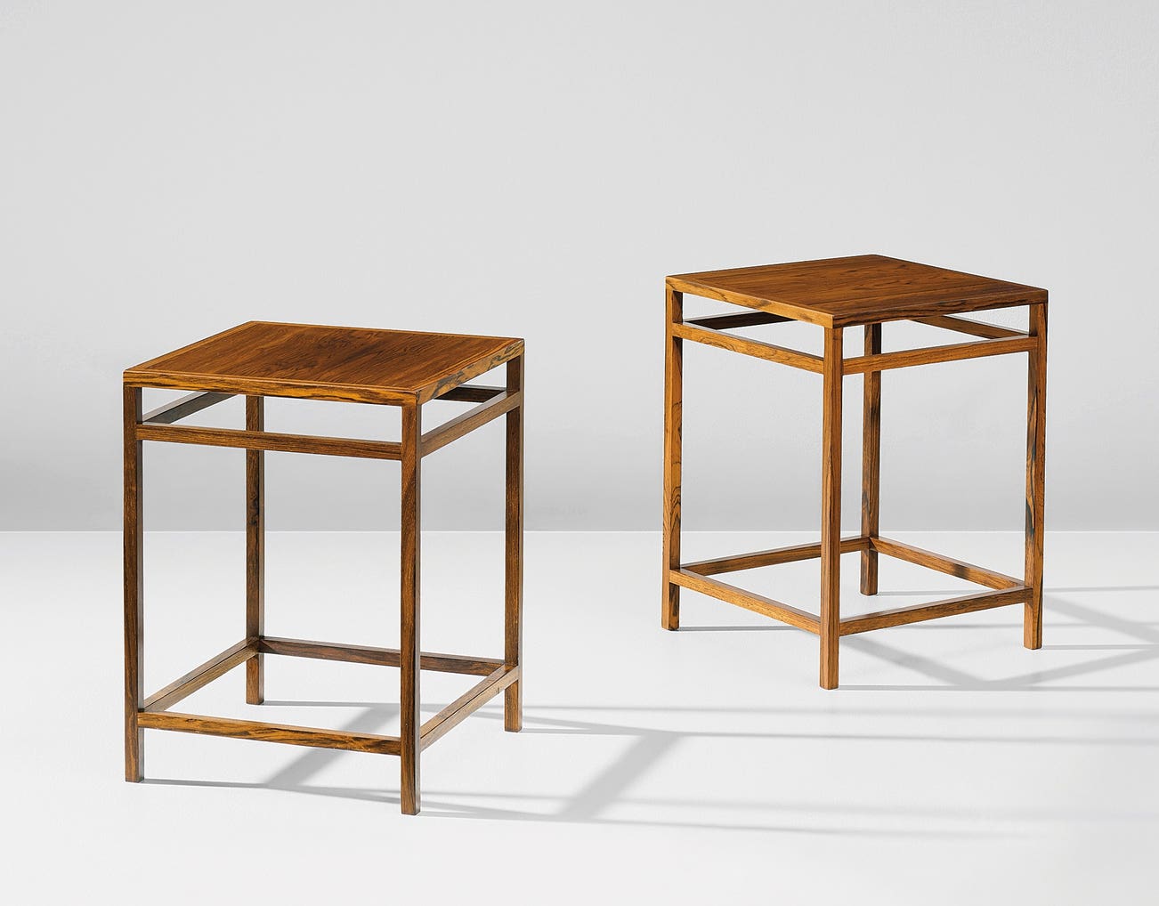 Executed by cabinetmaker Willy Beck, Copenhagen, Denmark. Underside of both with manufacturer's printed paper label PRODUCED BY/CABINET-MAKER/WILLY BECK/COPENHAGEN/DENMARK/ARCHITECTS: A. BENDER MADSEN AND EJNER LARSEN and the other PRODUCED BY/CABINET-MAKER/WILLY BECK/COPENHAGEN/DENMARK respectively. Produced circa 1955.