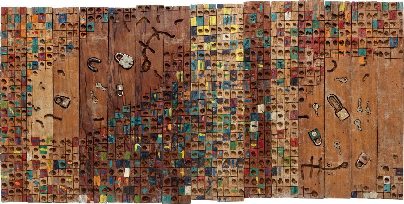 acrylic, keys and padlocks on carved wood, in 15 parts